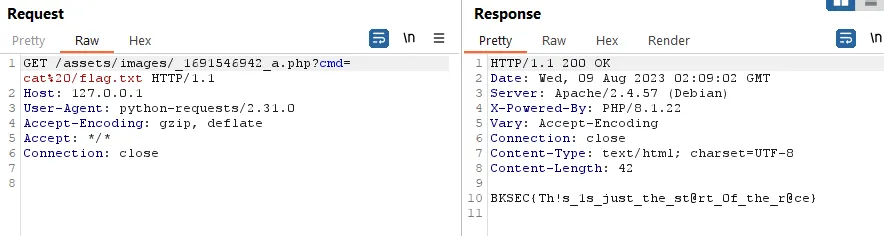 pool = ThreadPool(10)result = pool.map_async(get, range(20)).get(6)Script trên sẽ liên tục up file độc hại a.php lên và liên tục gọi đến file kèm command mình muốn thực thi ở phía sau. Set proxy 127.0.0.1:8080 để có thể xem các request trên burpsuite. Nếu không thành công thì có thể nới rộng thời gian chạy của script bằng cách tăng thời gian khác biệt giữa thời điểm bắt đầu up file và file ước lượng sẽ có ở tương lai ở dòng 8 và tăng thời gian chạy của script ở dòng 34.