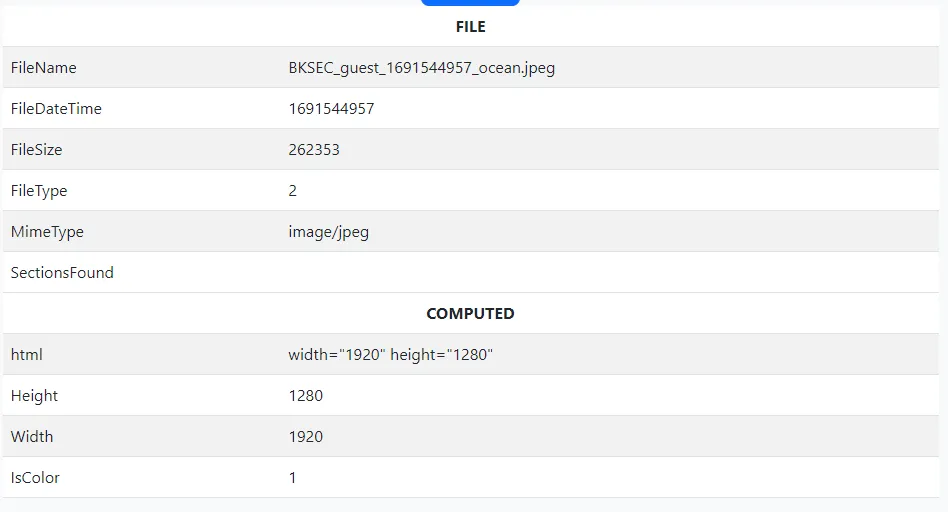 if ($exif === false) { $error .= '<p class="h5 text-danger">No metadata found.</p>'; } else { $metadata = '<table class="table table-striped">'; foreach ($exif as $key => $section) { $metadata .= '<thead><tr><th colspan="2" class="text-center">' . $key . "</th></tr></thead><tbody>"; foreach ($section as $name => $value) { $metadata .= "<tr><td>" . $name . "</td><td>" . $value . "</td></tr>"; } $metadata .= "</tbody>"; } $metadata .= "</table>"; } }}?><!DOCTYPE html><!-- Modified from https://getbootstrap.com/docs/5.3/examples/checkout --><html lang="en" data-bs-theme="auto">