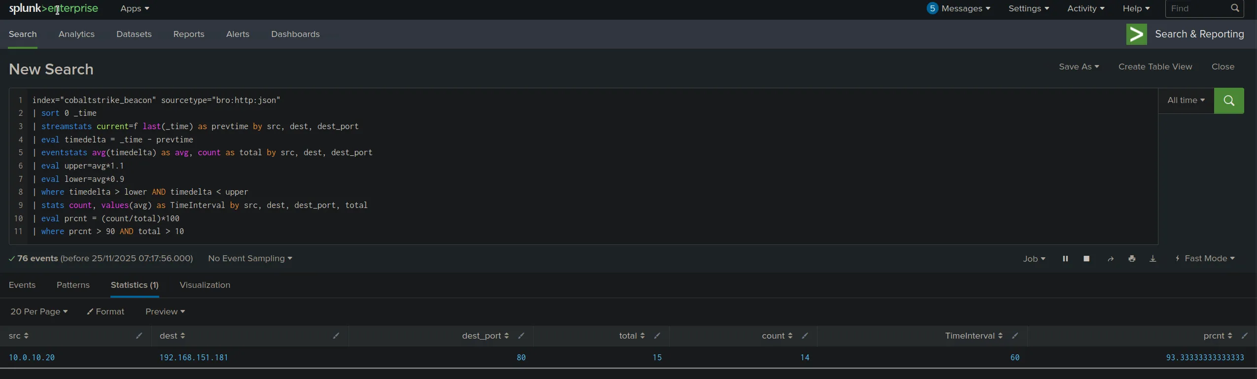 With that Splunk query, we can detect beaconing patterns even when the intervals are not perfectly consistent. The key is to look for connections that fall within a narrow statistical range around their average interval, which is characteristic of beaconing behavior.