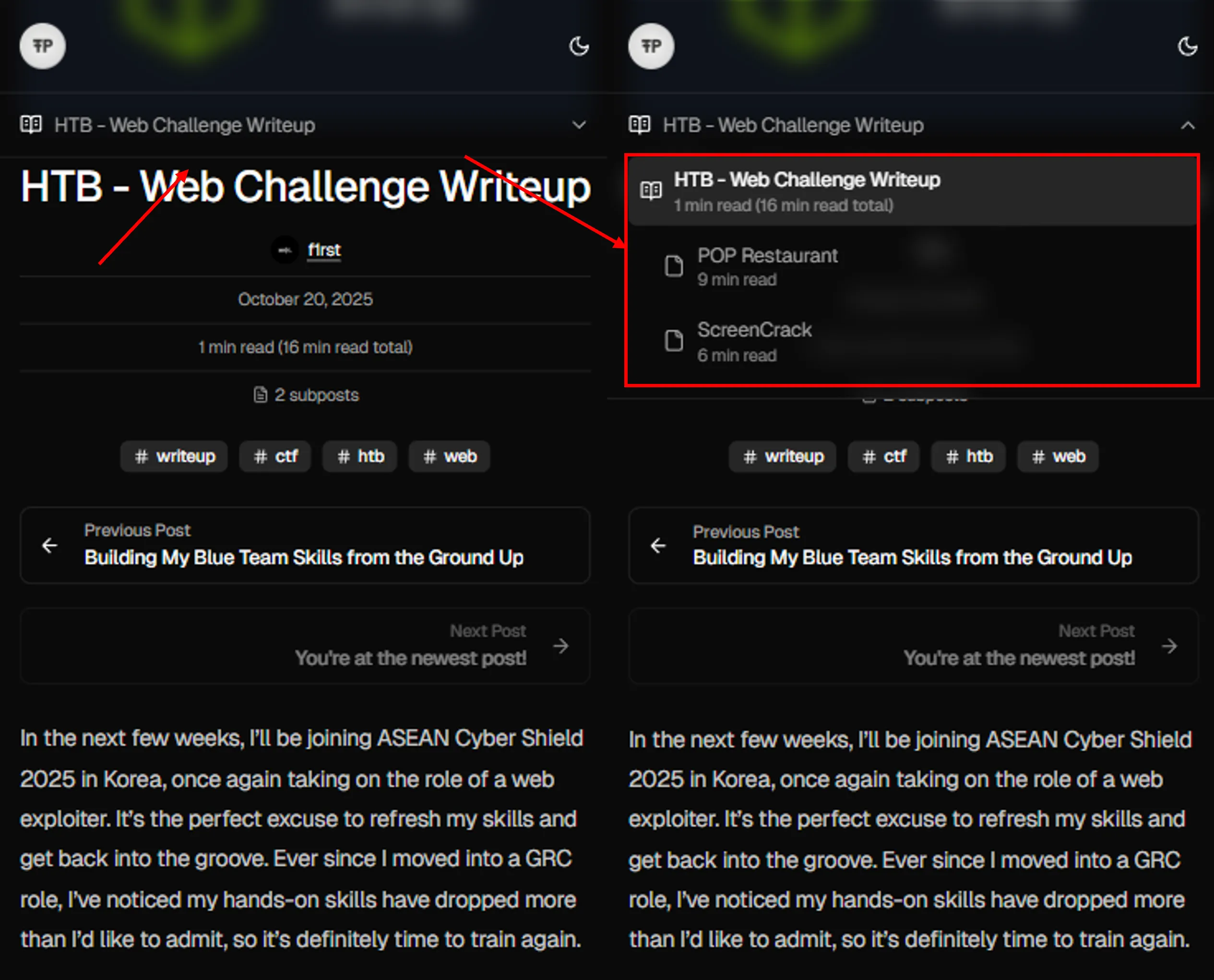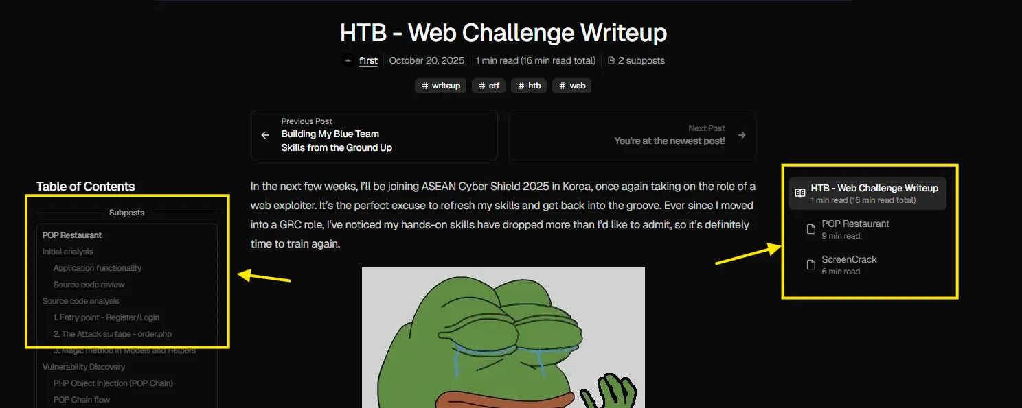 You can check out the sub-post on the side if you’re on desktop, or in the mobile navigation bar if you’re on your phone, for detailed writeups of each challenge.
