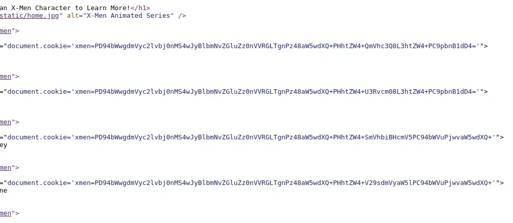 Trang web có những button mà khi click vào sẽ dẫn ta tới /xmen kèm theo việc set giá trị của cookie theo từng button.