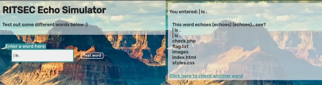 Dễ đoán được phía sau web này server sẽ chạy dòng lệnh tương tự echo test . Thử thực thi thêm lệnh ls bằng cách nhập.