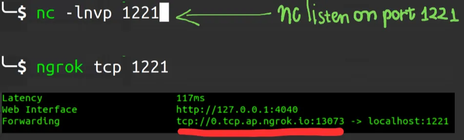 Việc bây giờ là tạo payload để cho vào phần cmd kèm theo việc tạo 1 tcp server để có thể kết nối đc. Mình setup localhost listen tại port 1221 và sử dụng ngrok để tunnel localhost tới internet: