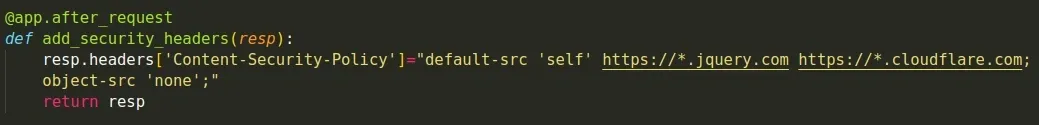 resp.headers['Content-Security-Policy']="default-src 'self' https://*.jquery.com https://*.cloudflare.com; object-src 'none';"
